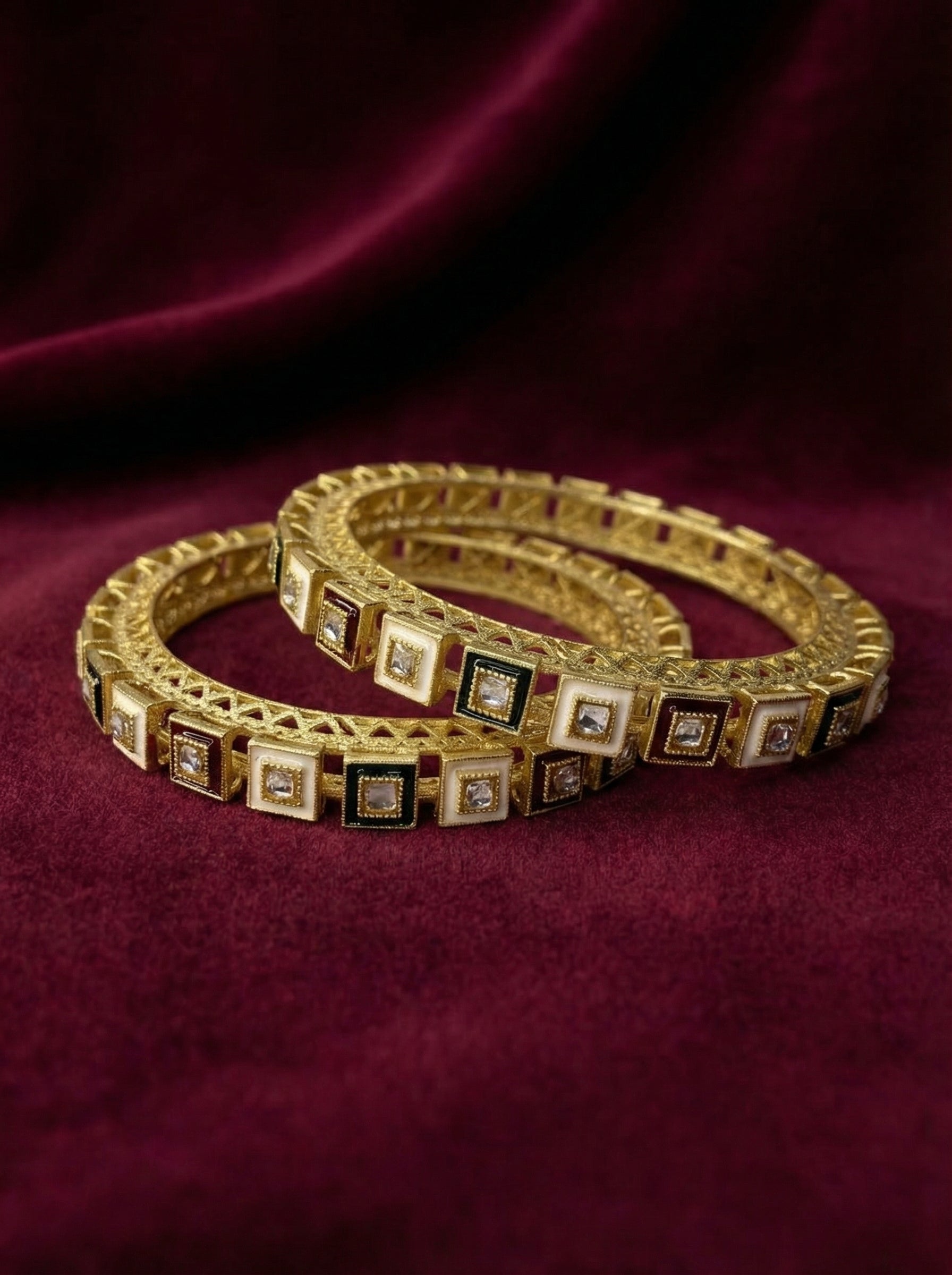Get the festive glow with these stunning Kundan bangles. Crafted with gold plating and intricate Kundan stones, they're the perfect piece for weddings, celebrations, and everyday elegance. Our artificial jewelry collection brings you that traditional Indian look with the comfort you need. These lightweight bangles feature vibrant enamel work in red, green, and white that catches every light beautifully. Whether you're dressing up for a special occasion or adding some sparkle to your ethnic outfits, these Kundan bangles work perfectly. Each pair is handcrafted to bring out the finest details and the authentic charm of traditional Indian jewelry. Wear them with confidence knowing you have premium quality that lasts.