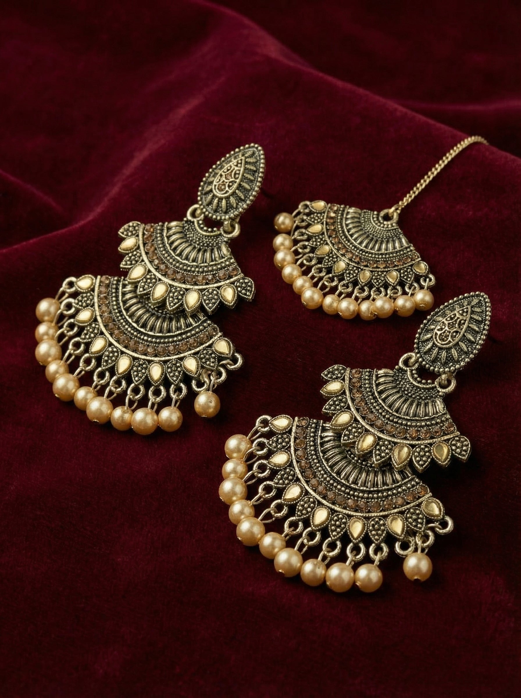 Get that perfect bridal or festive look with this stunning maang tikka and earring set. The intricate gold plating gives you that luxurious antique feel without the weight, making it super comfortable to wear all day. The matching dangling earrings have beautiful pearl-like drops that catch light beautifully with the detailed metalwork above.