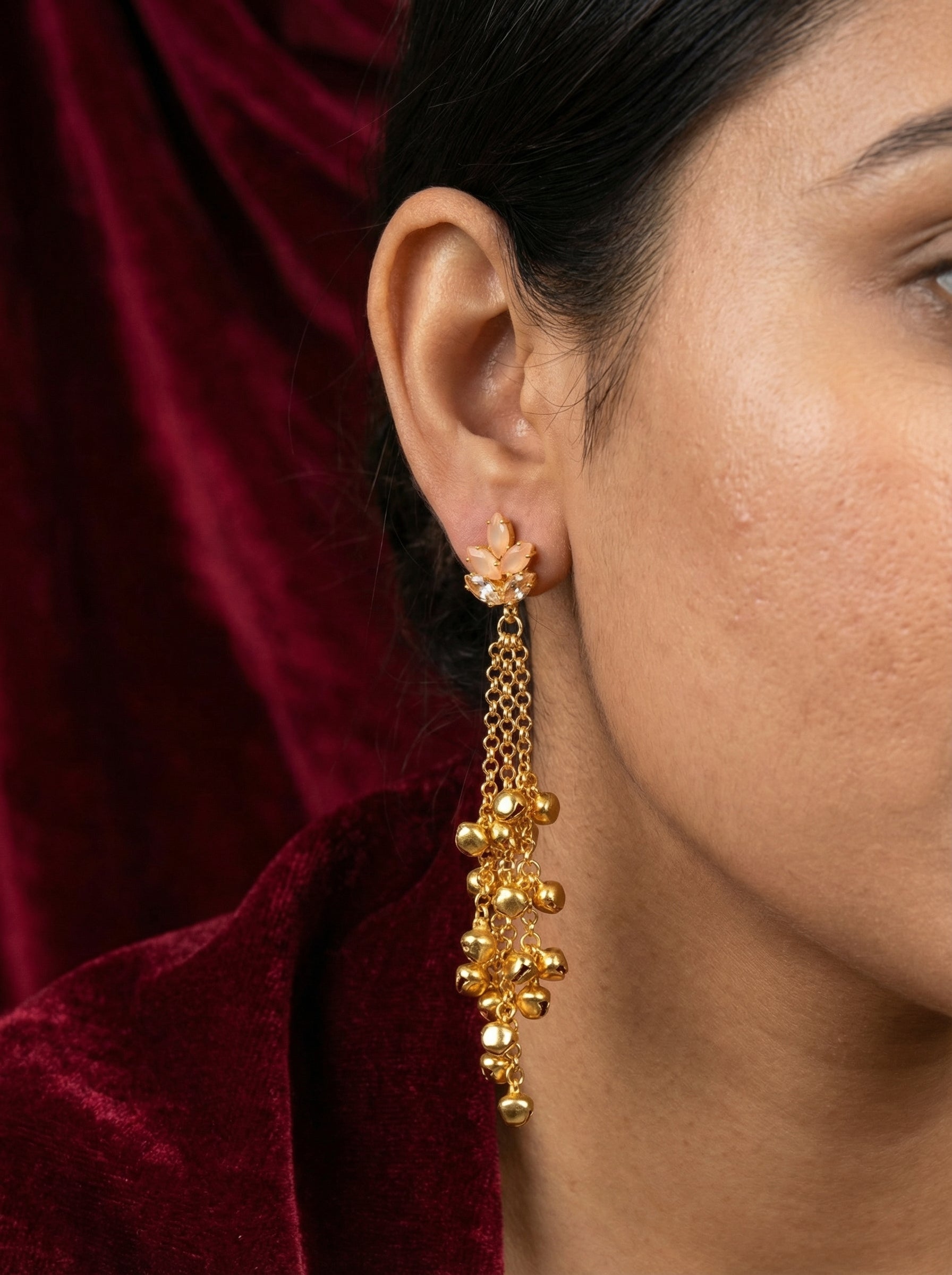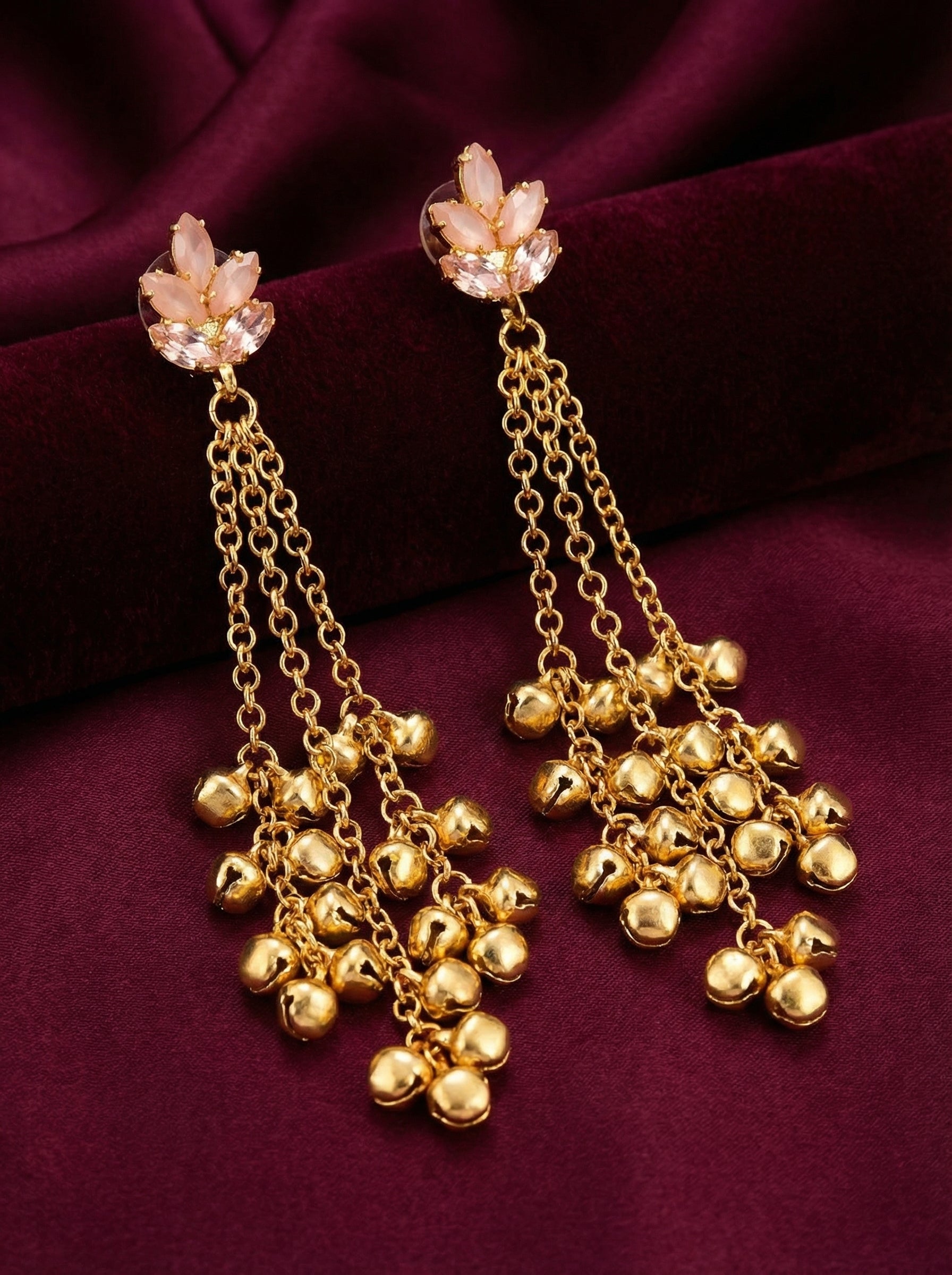 These exquisite multi-tiered chandelier earrings are a celebration of traditional Indian jewelry artistry. With their intricate layers and ornate gold-tone detailing, they capture the essence of festive elegance. Every element has been carefully crafted to create movement and light, ensuring these earrings shimmer with every turn of your head.